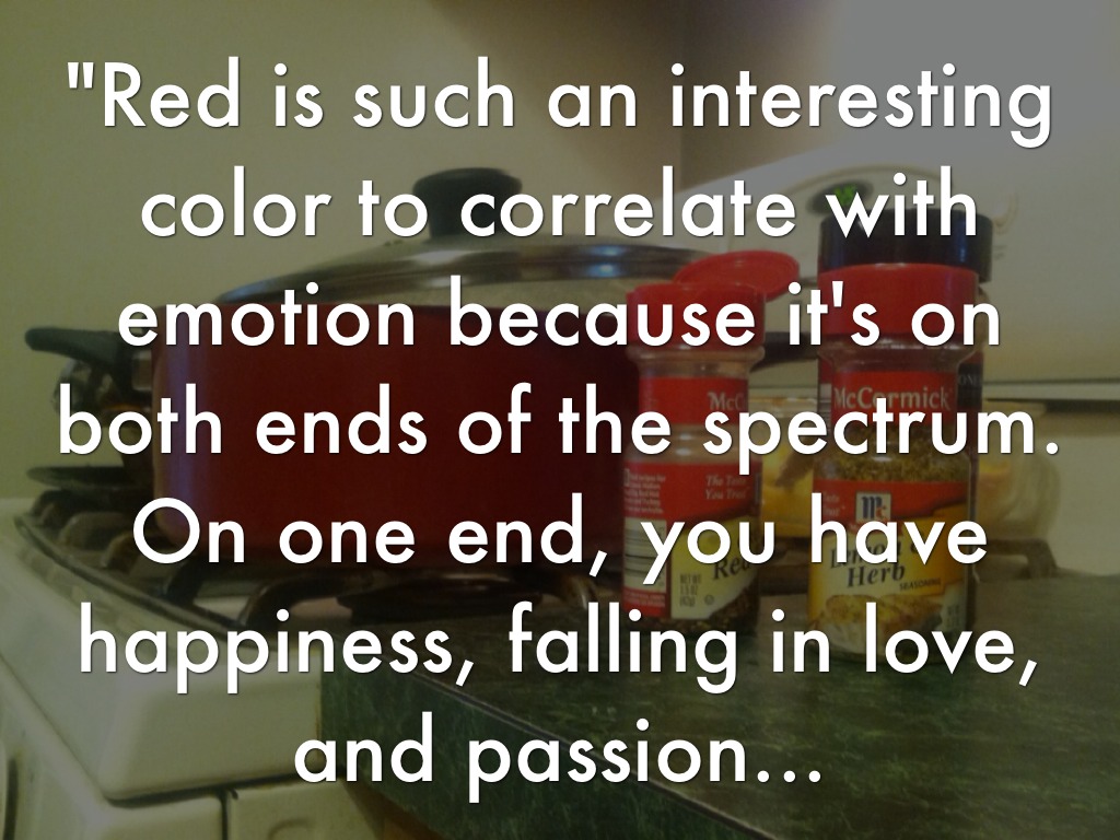 "Red is such an interesting color to correlate with emotion because it's on both ends of the spectrum. On one end, you have happiness, falling in love, and passion...