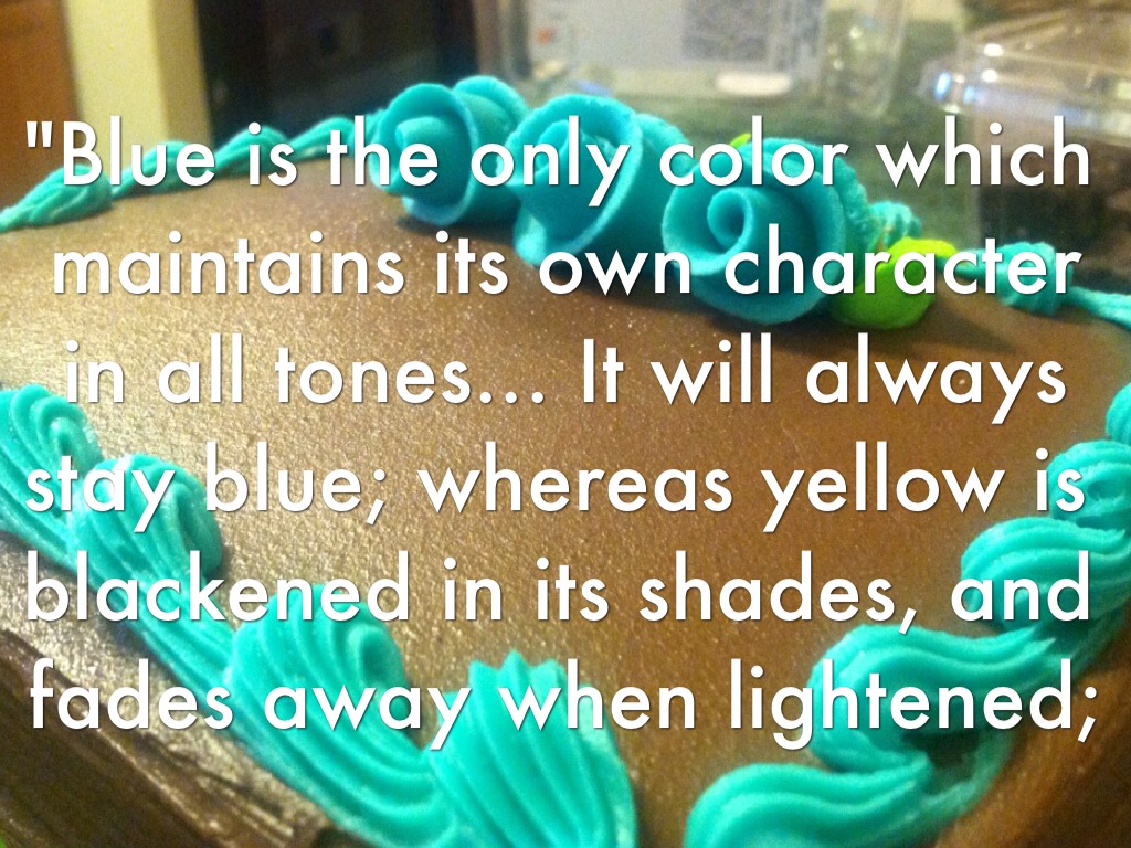 "Blue is the only color which maintains its own character in all tones... It will always stay blue; whereas yellow is blackened in its shades, and fades away when lightened;