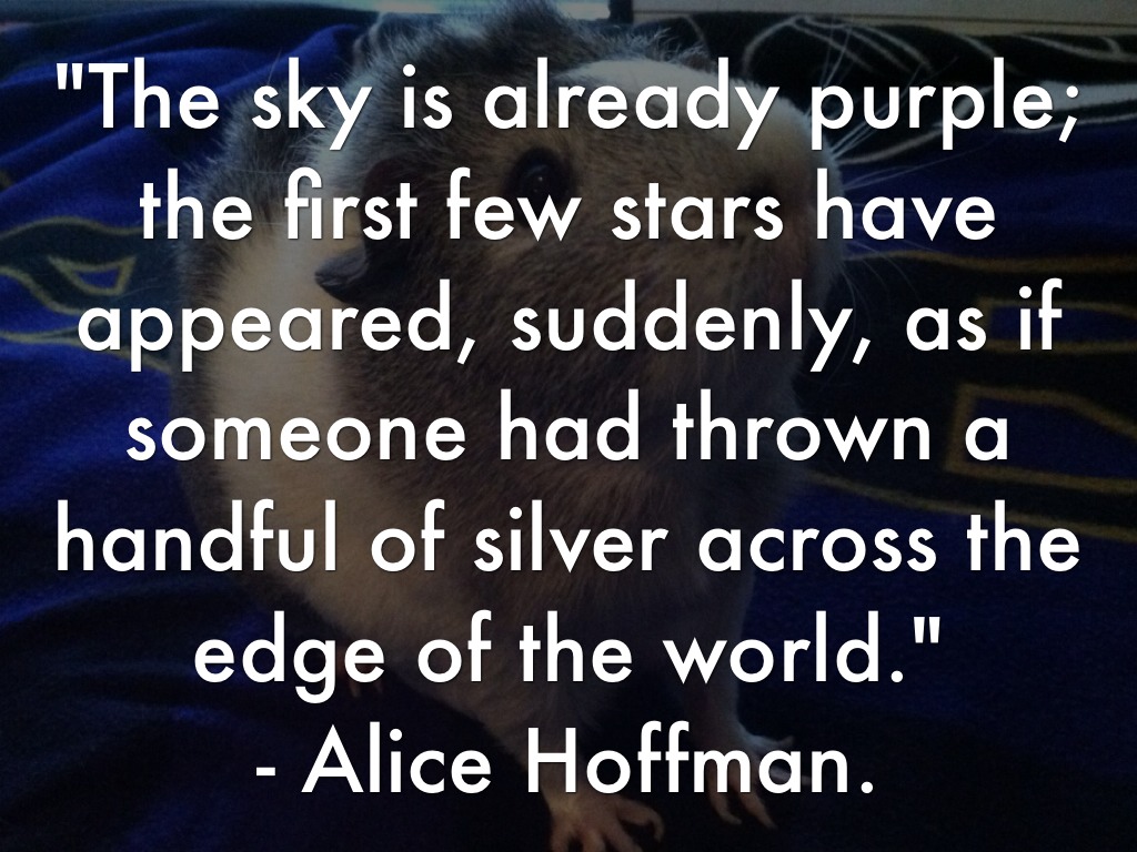 "The sky is already purple; the first few stars have appeared, suddenly, as if someone had thrown a handful of silver across the edge of the world."