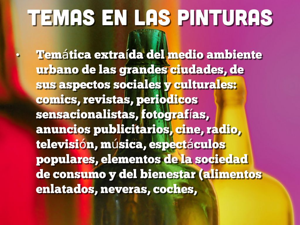 Temática extraída del medio ambiente urbano de las grandes ciudades, de sus aspectos sociales y culturales: comics, revistas, periodicos sensacionalistas, fotografías, anuncios publicitarios, cine, radio, televisión, música, espectáculos populares, elementos de la sociedad de consumo y del bienestar (alimentos enlatados, neveras, coches, autopistas, gasolineras, etc.).