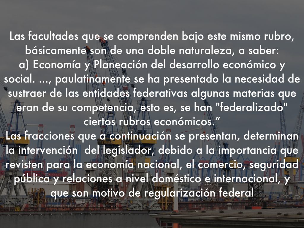 Las facultades que se comprenden bajo este mismo rubro, básicamente son de una doble naturaleza, a saber: a) Economía y Planeación del desarrollo económico y social. ..., paulatinamente se ha presentado la necesidad de sustraer de las entidades federativas algunas materias que eran de su competencia, esto es, se han "federalizado" ciertos rubros económicos.” Las fracciones que a continuación se presentan, determinan la intervención del legislador, debido a la importancia que revisten para la economía nacional, el comercio, seguridad pública y relaciones a nivel doméstico e internacional, y que son motivo de regularización federal