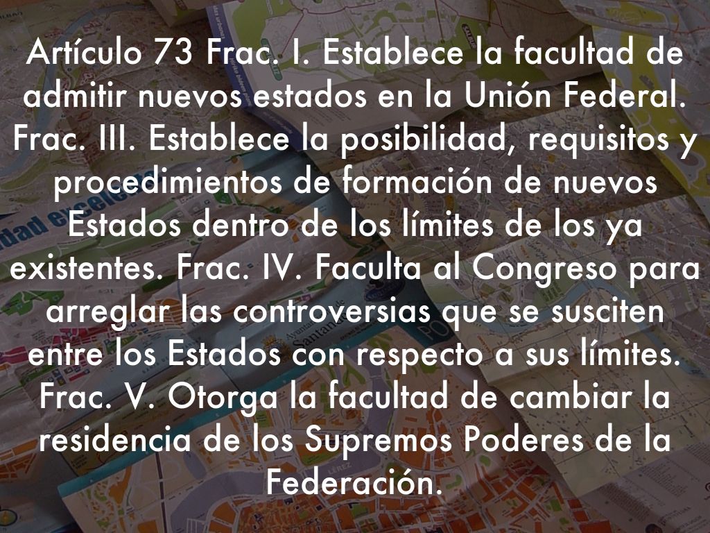 Artículo 73 Frac. I. Establece la facultad de admitir nuevos estados en la Unión Federal. Frac. III. Establece la posibilidad, requisitos y procedimientos de formación de nuevos Estados dentro de los límites de los ya existentes. Frac. IV. Faculta al Congreso para arreglar las controversias que se susciten entre los Estados con respecto a sus límites. Frac. V. Otorga la facultad de cambiar la residencia de los Supremos Poderes de la Federación.