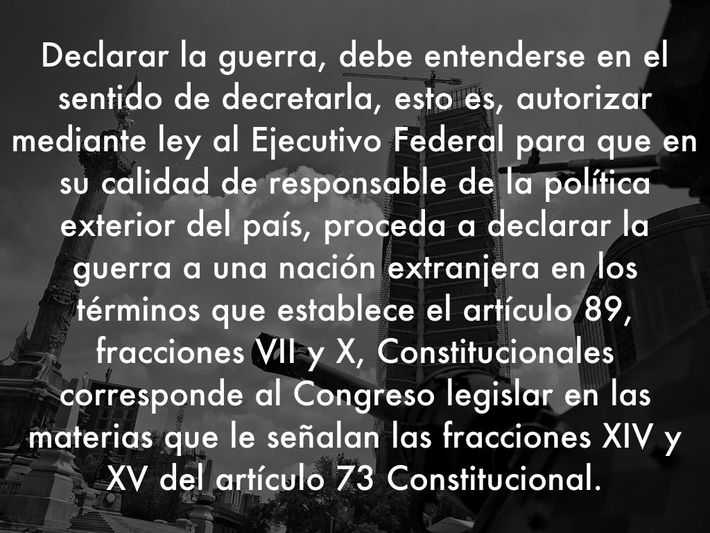 Declarar la guerra, debe entenderse en el sentido de decretarla, esto es, autorizar mediante ley al Ejecutivo Federal para que en su calidad de responsable de la política exterior del país, proceda a declarar la guerra a una nación extranjera en los términos que establece el artículo 89, fracciones VII y X, Constitucionales corresponde al Congreso legislar en las materias que le señalan las fracciones XIV y XV del artículo 73 Constitucional.