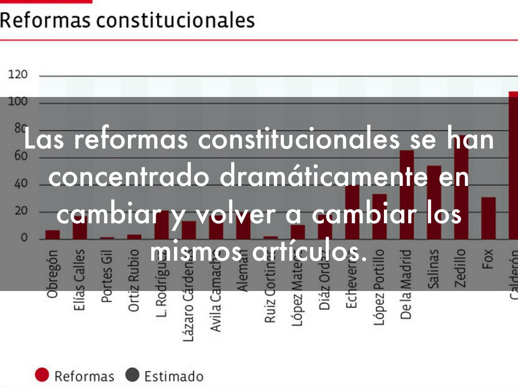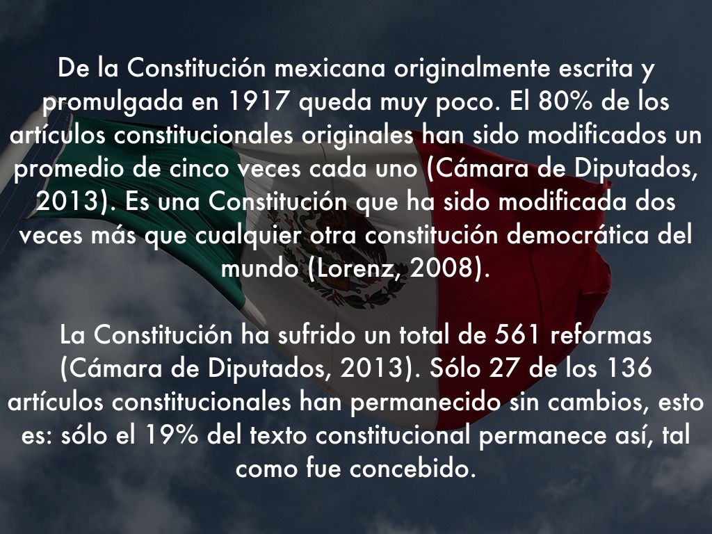 De la Constitución mexicana originalmente escrita y promulgada en 1917 queda muy poco. El 80% de los artículos constitucionales originales han sido modificados un promedio de cinco veces cada uno (Cámara de Diputados, 2013). Es una Constitución que ha sido modificada dos veces más que cualquier otra constitución democrática del mundo (Lorenz, 2008).