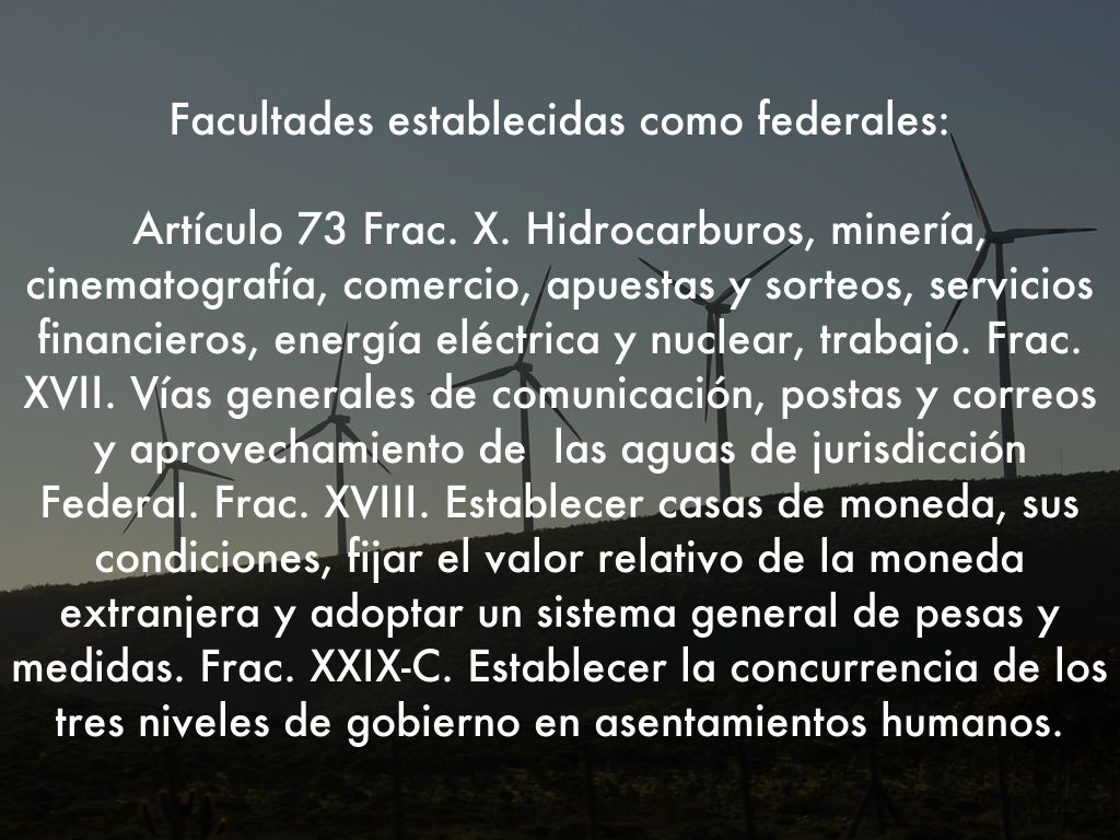 Artículo 73 Frac. X. Hidrocarburos, minería, cinematografía, comercio, apuestas y sorteos, servicios financieros, energía eléctrica y nuclear, trabajo. Frac. XVII. Vías generales de comunicación, postas y correos y aprovechamiento de las aguas de jurisdicción Federal. Frac. XVIII. Establecer casas de moneda, sus condiciones, fijar el valor relativo de la moneda extranjera y adoptar un sistema general de pesas y medidas. Frac. XXIX-C. Establecer la concurrencia de los tres niveles de gobierno en asentamientos humanos.