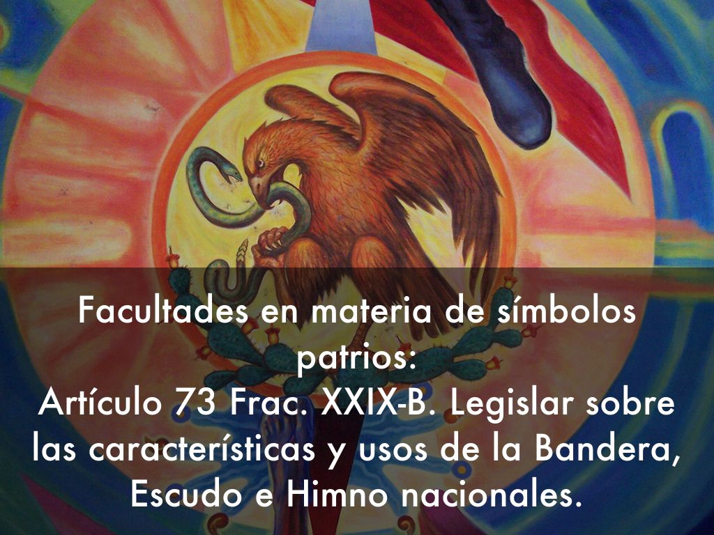 Facultades en materia de símbolos patrios: Artículo 73 Frac. XXIX-B. Legislar sobre las características y usos de la Bandera, Escudo e Himno nacionales.