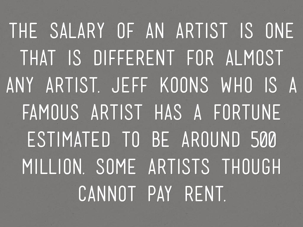 the salary of an artist is one that is different for almost any artist. Jeff koons who Is a famous artist has a fortune estimated to be around 500 million. some artists though cannot pay rent.