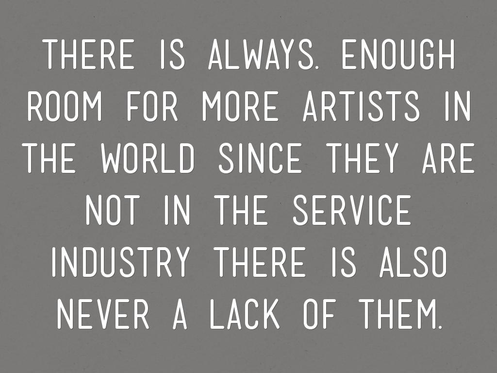 there is always. enough room for more artists in the world since they are not in the service industry there is also never a lack of them.