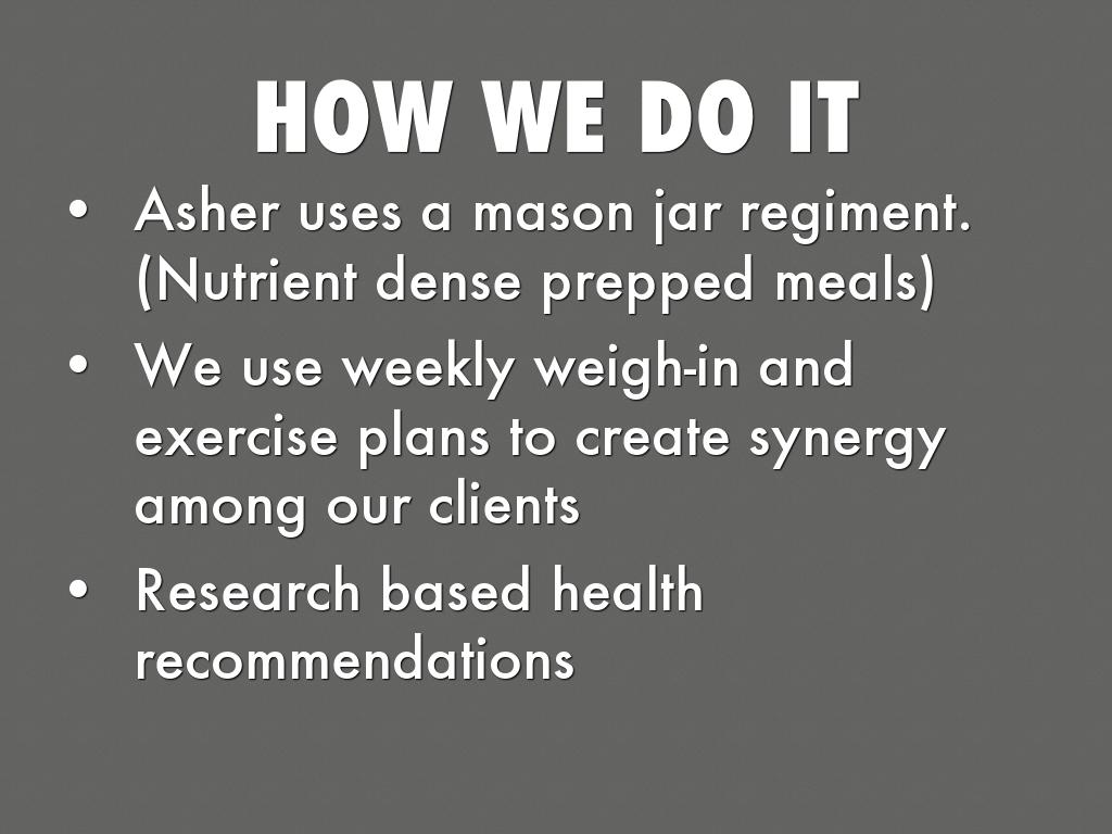 Asher uses a mason jar regiment. (Nutrient dense prepped meals)