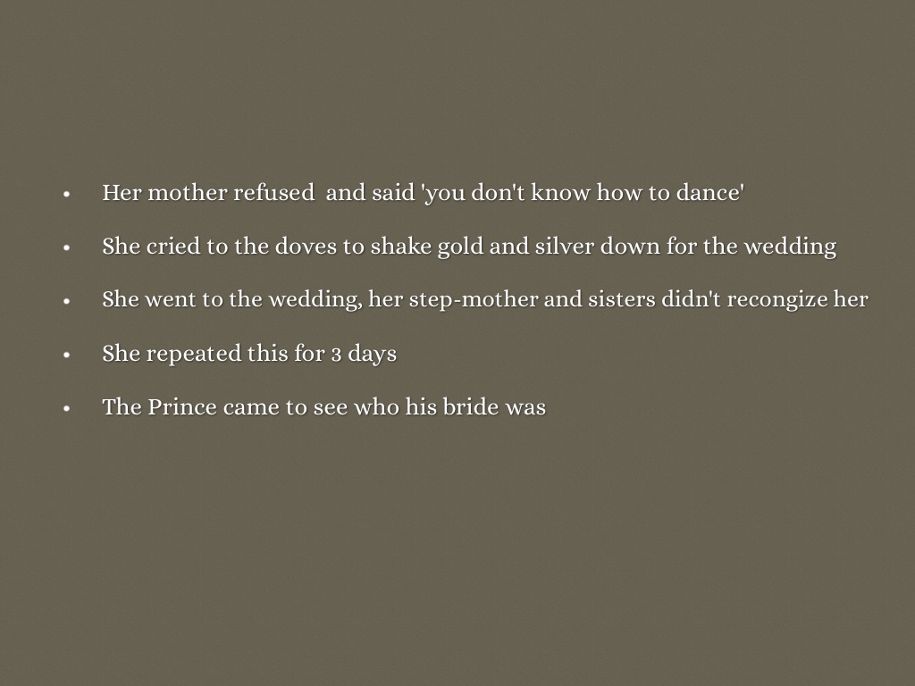 • Ashputtle went to the garden and cried to the doves