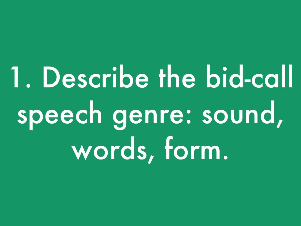1. Describe the bid-call speech genre: sound, words, form.
