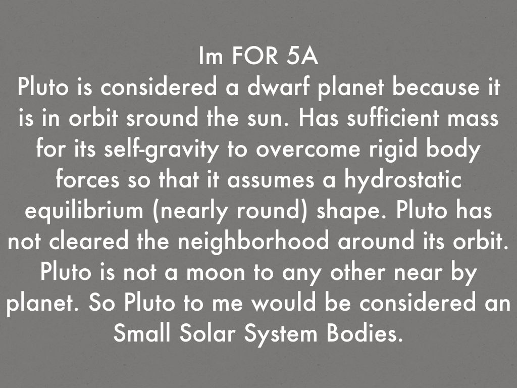 Pluto is considered a dwarf planet because it is in orbit sround the sun. Has sufficient mass for its self-gravity to overcome rigid body forces so that it assumes a hydrostatic equilibrium (nearly round) shape. Pluto has not cleared the neighborhood around its orbit. Pluto is not a moon to any other near by planet. So Pluto to me would be considered an Small Solar System Bodies.