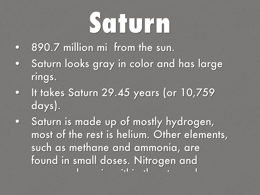 Saturn is made up of mostly hydrogen, most of the rest is helium. Other elements, such as methane and ammonia, are found in small doses. Nitrogen and oxygen also mix within the atmosphere.