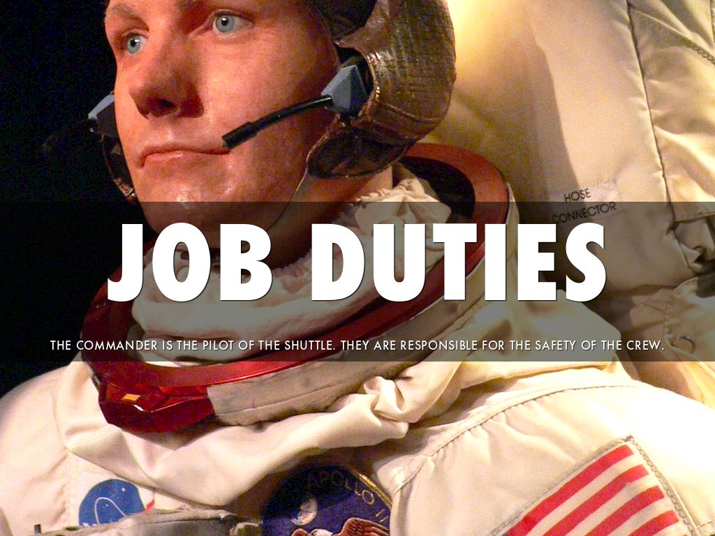 THE COMMANDER IS THE PILOT OF THE SHUTTLE. THEY ARE RESPONSIBLE FOR THE SAFETY OF THE CREW.
