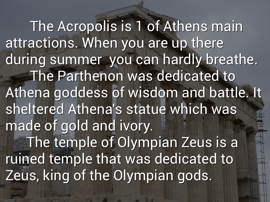 The Acropolis is 1 of Athens main attractions. When you are up there during summer you can hardly breathe. The Parthenon was dedicated to Athena goddess of wisdom and battle. It sheltered Athena's statue which was made of gold and ivory. The temple of Olympian Zeus is a ruined temple that was dedicated to Zeus, king of the Olympian gods.