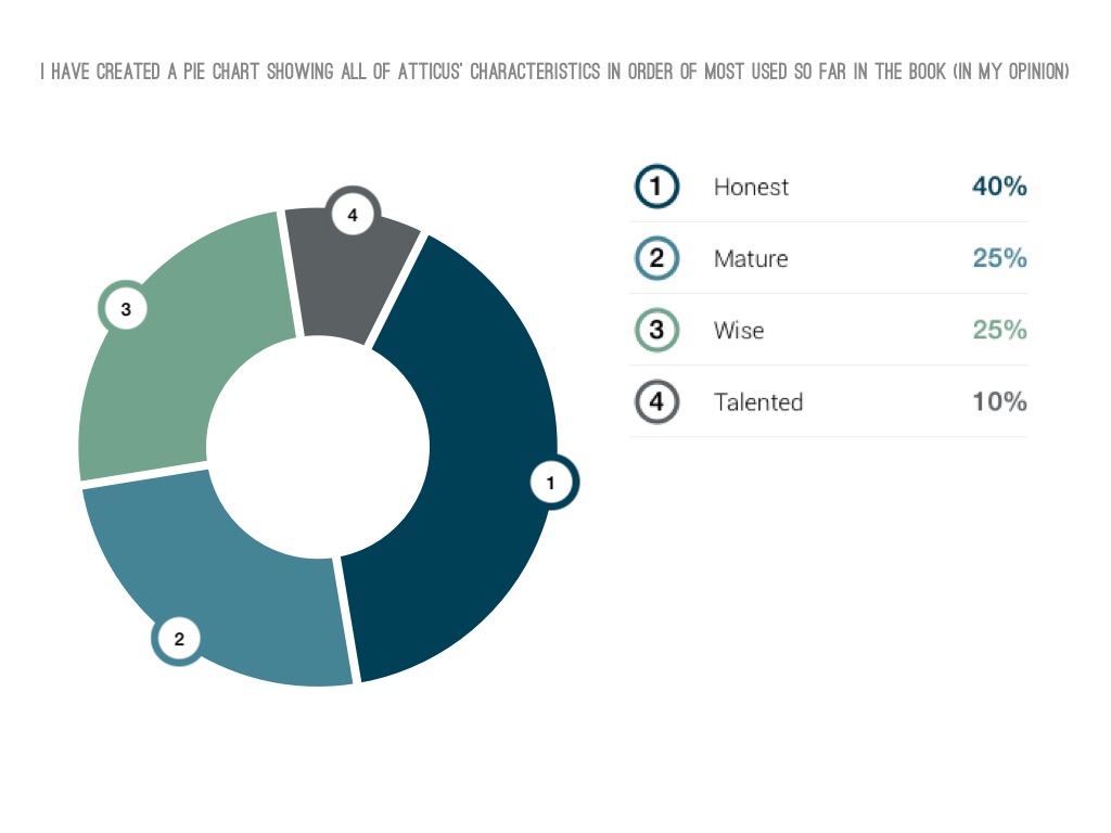 I HAVE CREATED A PIE CHART SHOWING ALL OF ATTICUS' CHARACTERISTICS IN ORDER OF MOST USED SO FAR IN THE BOOK (IN MY OPINION)