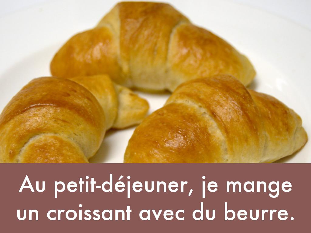 Au petit-déjeuner, je mange un croissant avec du beurre.