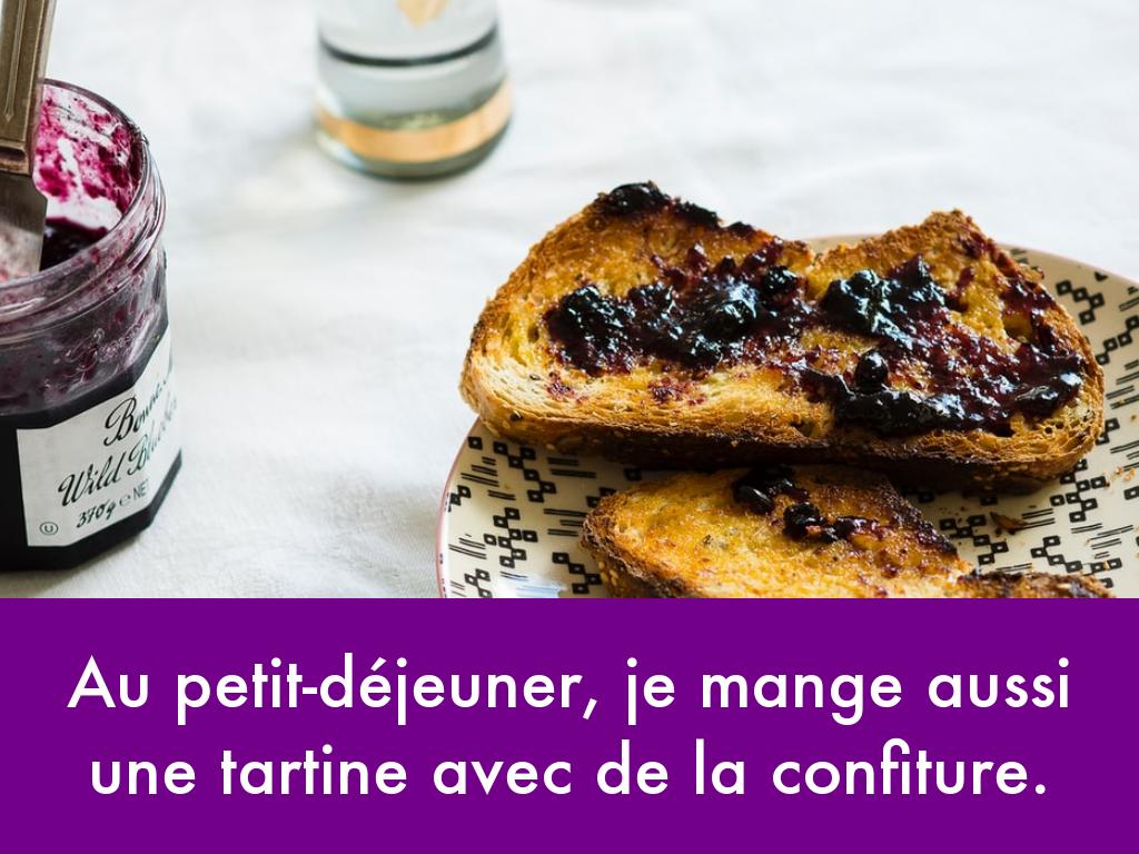 Au petit-déjeuner, je mange aussi une tartine avec de la confiture.