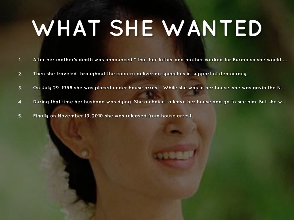 On July 29, 1988 she was placed under house arrest. While she was in her house, she was gavin the Nobel peace medal .