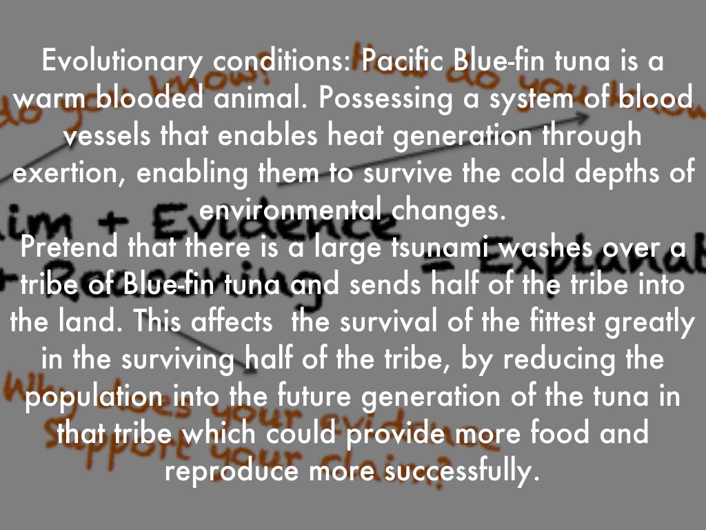 Evolutionary conditions: Pacific Blue-fin tuna is a warm blooded animal. Possessing a system of blood vessels that enables heat generation through exertion, enabling them to survive the cold depths of environmental changes.
