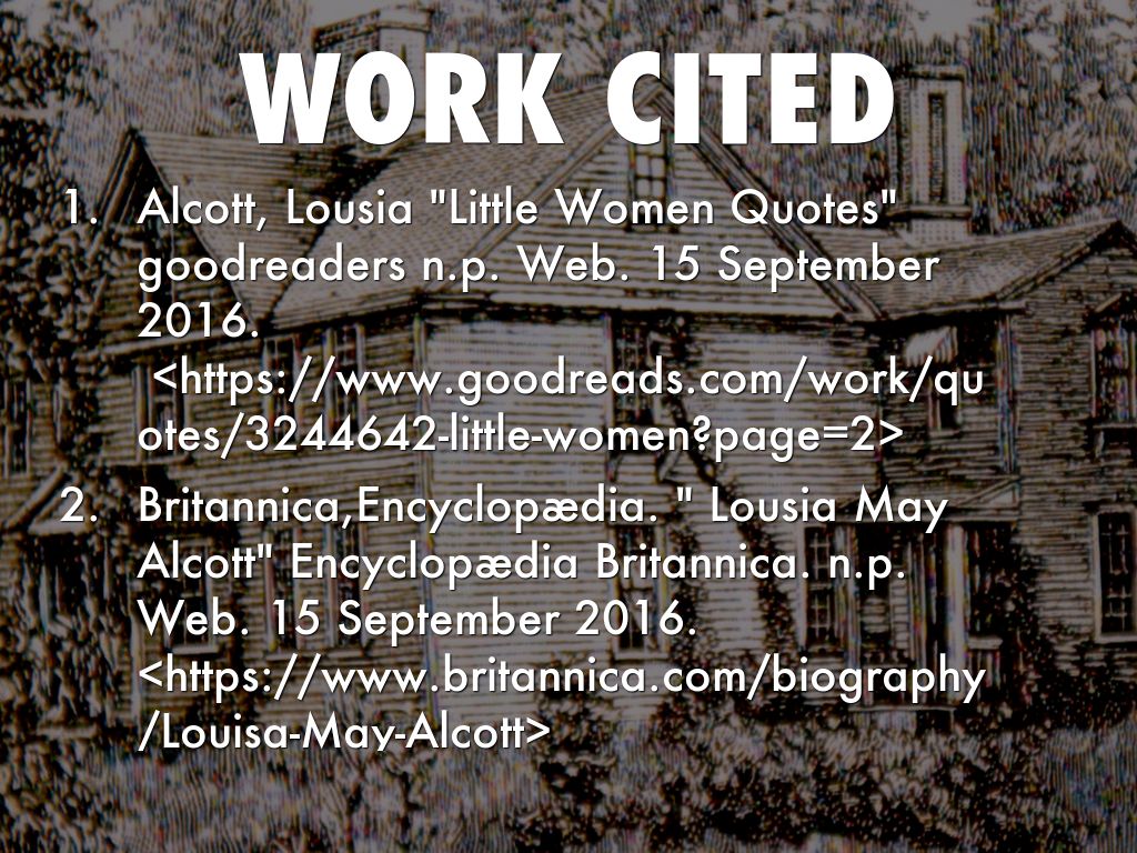 Lousia May Alcott was an American novelist and poet best know for her novel Little Woman and its sequel Little Men. She was born in Germantown, Pennsylvania, on November 29, 1832. Lousia had 3 sisters and was educated by her father. Her father was a huge motivation when it came to her education, during a time of his Temple School in Boston and eventually at home. Lousia first began to write potboilers, which were violent tales. Her later works were depictions of woman as strong and self-reliant. She volunteered as a nurse after the American Civil War. Yet she contracted typhoid from the unsanitary hospital conditions. She was never the same after that, she wrote a book called "Hospital Sketches" which brought her the first taste of fame. Her stories began to appear in "The Atlantic Monthly" and because of family issues pressing she wrote the autobiographical "Little Woman" which was a huge success.