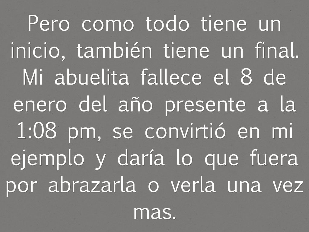 Pero como todo tiene un inicio, también tiene un final. Mi abuelita fallece el 8 de enero del año presente a la 1:08 pm, se convirtió en mi ejemplo y daría lo que fuera por abrazarla o verla una vez mas.