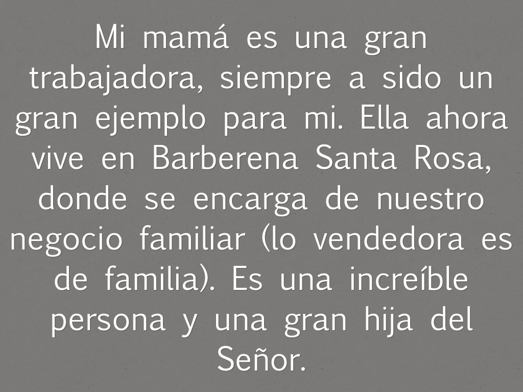 Mi mamá es una gran trabajadora, siempre a sido un gran ejemplo para mi. Ella ahora vive en Barberena Santa Rosa, donde se encarga de nuestro negocio familiar (lo vendedora es de familia). Es una increíble persona y una gran hija del Señor.