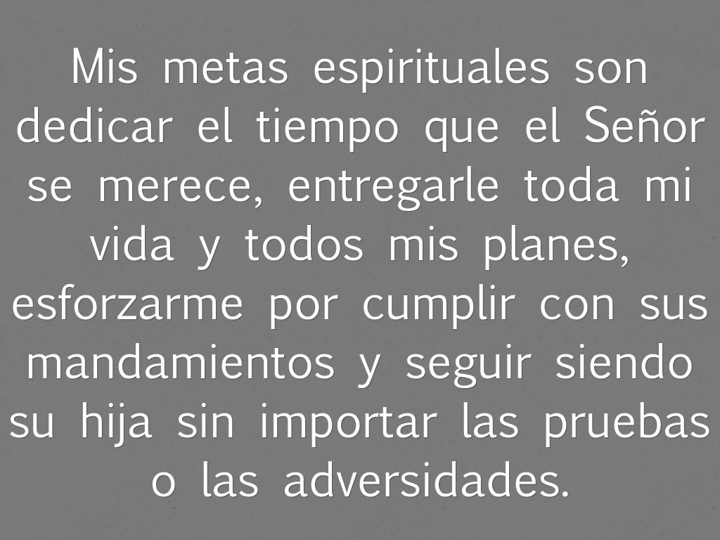 Mis metas espirituales son dedicar el tiempo que el Señor se merece, entregarle toda mi vida y todos mis planes, esforzarme por cumplir con sus mandamientos y seguir siendo su hija sin importar las pruebas o las adversidades.