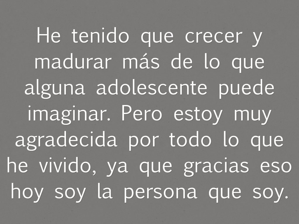 He tenido que crecer y madurar más de lo que alguna adolescente puede imaginar. Pero estoy muy agradecida por todo lo que he vivido, ya que gracias eso hoy soy la persona que soy.
