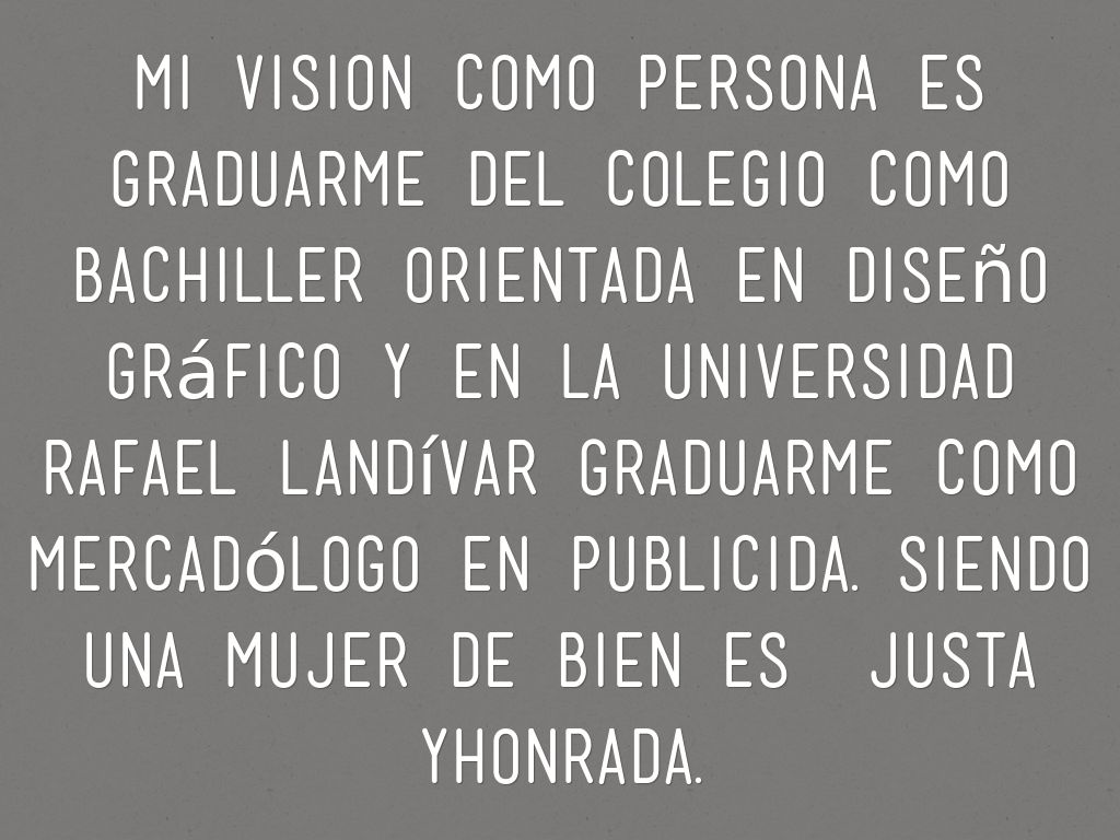 Mi vision como persona es graduarme del colegio como bachiller orientada en diseño gráfico y en la universidad Rafael Landívar graduarme como mercadólogo en publicida. Siendo una mujer de bien es justa yhonrada.