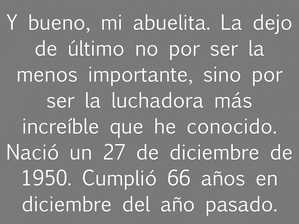 Y bueno, mi abuelita. La dejo de último no por ser la menos importante, sino por ser la luchadora más increíble que he conocido. Nació un 27 de diciembre de 1950. Cumplió 66 años en diciembre del año pasado.