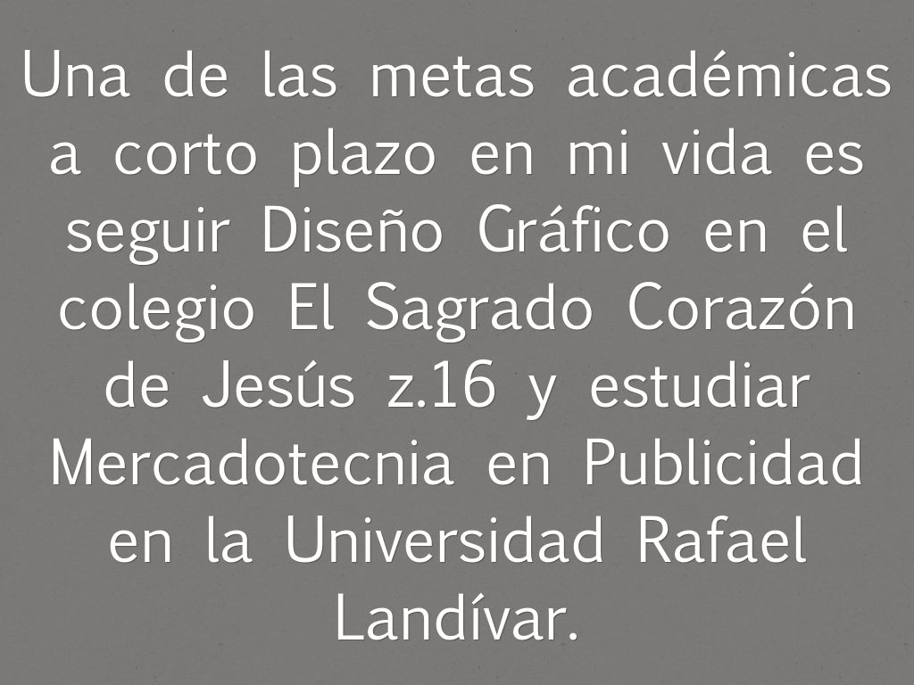 Una de las metas académicas a corto plazo en mi vida es seguir Diseño Gráfico en el colegio El Sagrado Corazón de Jesús z.16 y estudiar Mercadotecnia en Publicidad en la Universidad Rafael Landívar.
