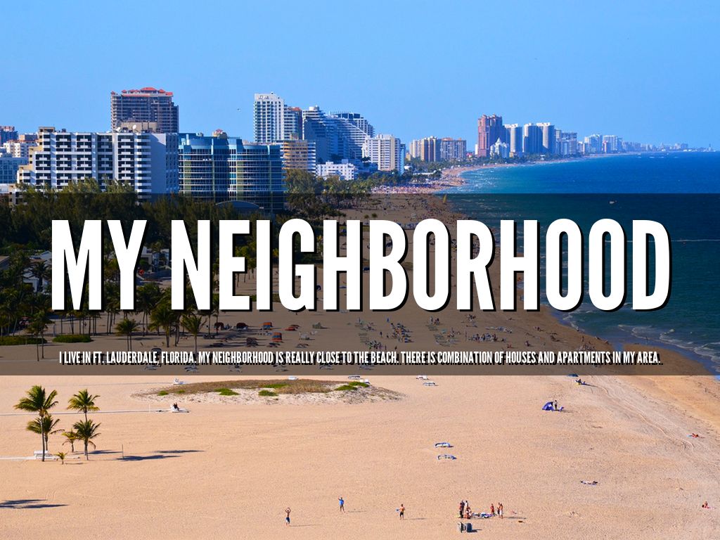 I LIVE IN FT. LAUDERDALE, FLORIDA. MY NEIGHBORHOOD IS REALLY CLOSE TO THE BEACH. THERE IS COMBINATION OF HOUSES AND APARTMENTS IN MY AREA.