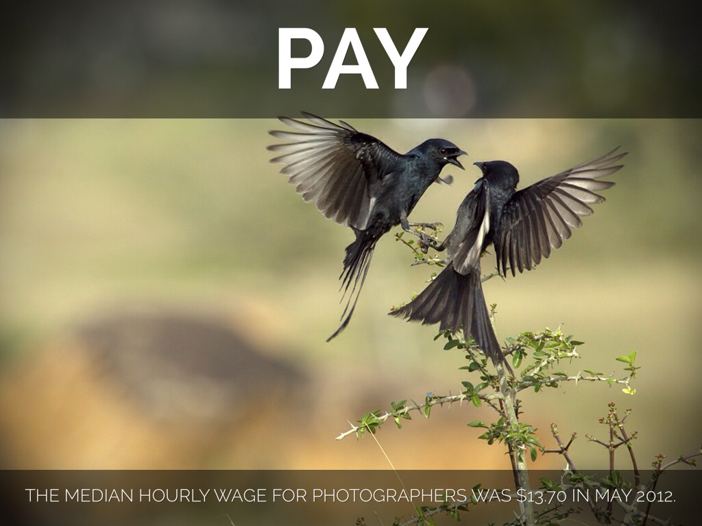 THE MEDIAN HOURLY WAGE FOR PHOTOGRAPHERS WAS $13.70 IN MAY 2012.