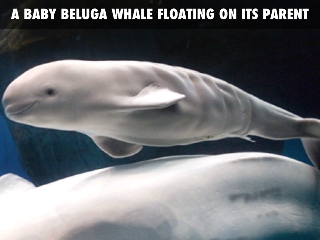 A BABY BELUGA WHALE FLOATING ON ITS PARENT