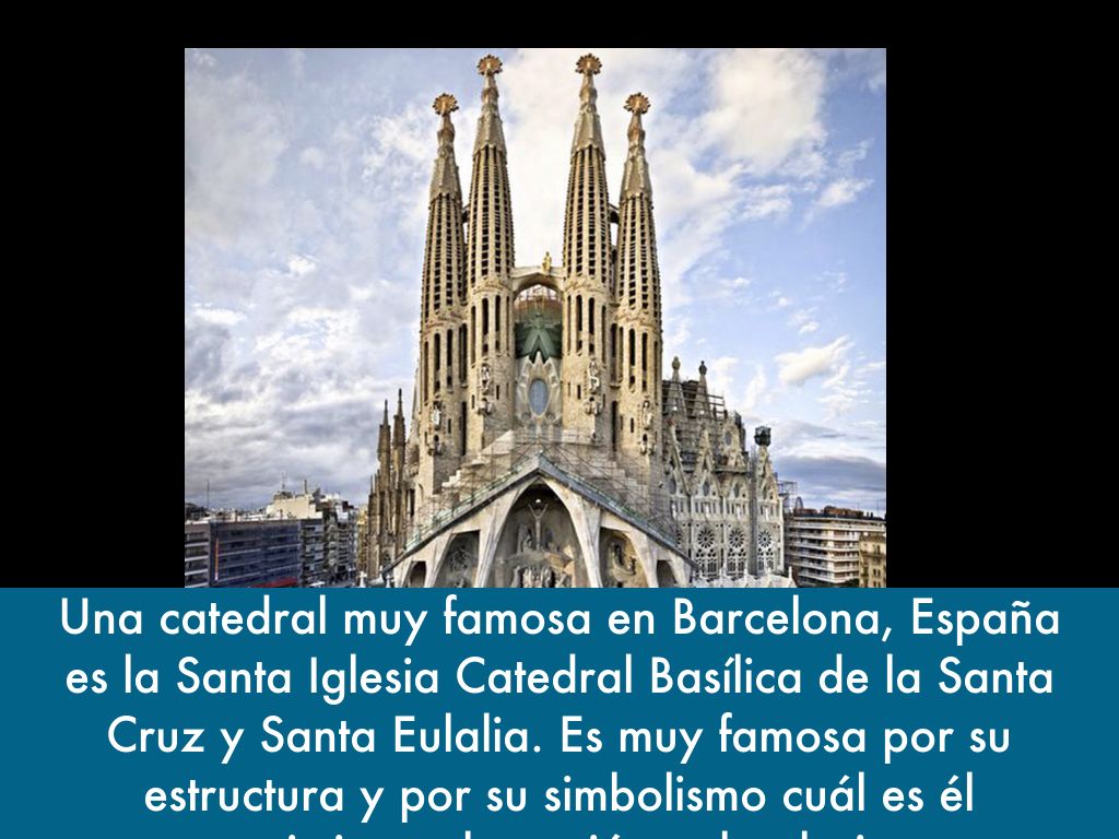 Una catedral muy famosa en Barcelona, España es la Santa Iglesia Catedral Basílica de la Santa Cruz y Santa Eulalia. Es muy famosa por su estructura y por su simbolismo cuál es él nacimiento, la pasión, y la gloria.