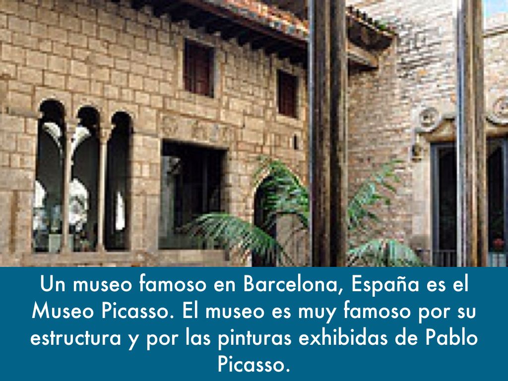 Un museo famoso en Barcelona, España es el Museo Picasso. El museo es muy famoso por su estructura y por las pinturas exhibidas de Pablo Picasso.