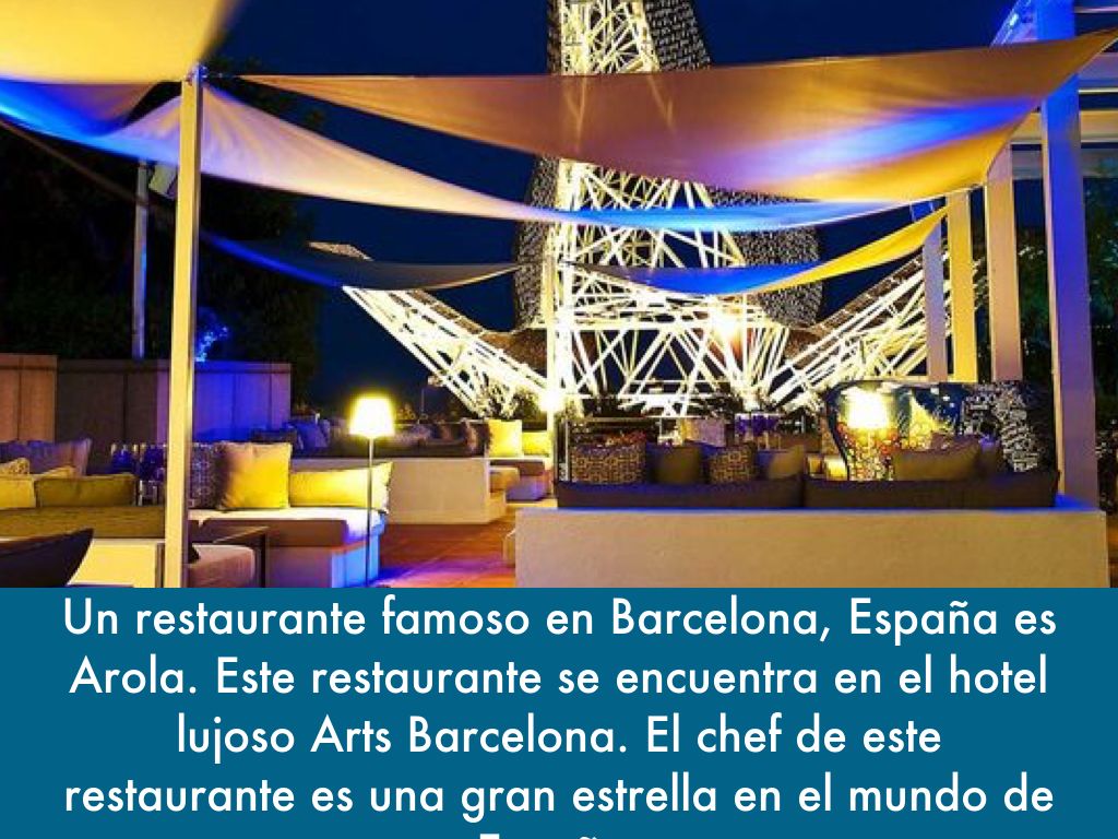 Un restaurante famoso en Barcelona, España es Arola. Este restaurante se encuentra en el hotel lujoso Arts Barcelona. El chef de este restaurante es una gran estrella en el mundo de España.