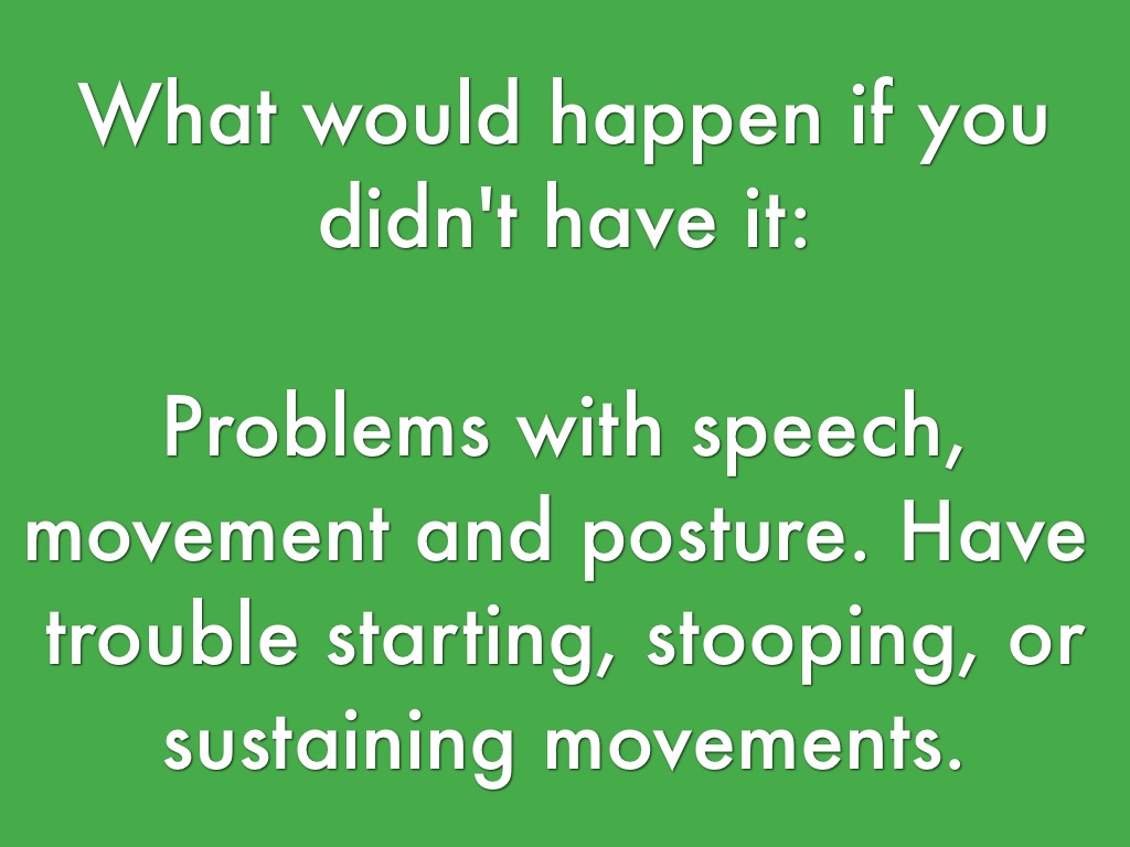 Problems with speech, movement and posture. Have trouble starting, stooping, or sustaining movements.