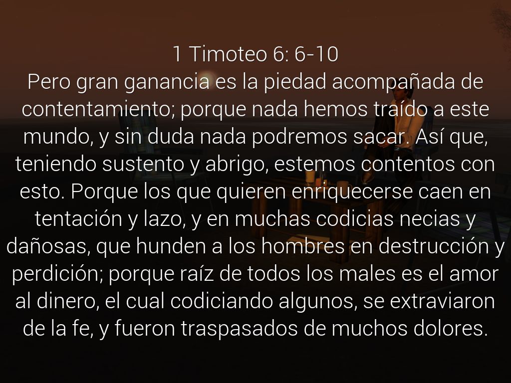 Pero gran ganancia es la piedad acompañada de contentamiento; porque nada hemos traído a este mundo, y sin duda nada podremos sacar. Así que, teniendo sustento y abrigo, estemos contentos con esto. Porque los que quieren enriquecerse caen en tentación y lazo, y en muchas codicias necias y dañosas, que hunden a los hombres en destrucción y perdición; porque raíz de todos los males es el amor al dinero, el cual codiciando algunos, se extraviaron de la fe, y fueron traspasados de muchos dolores.