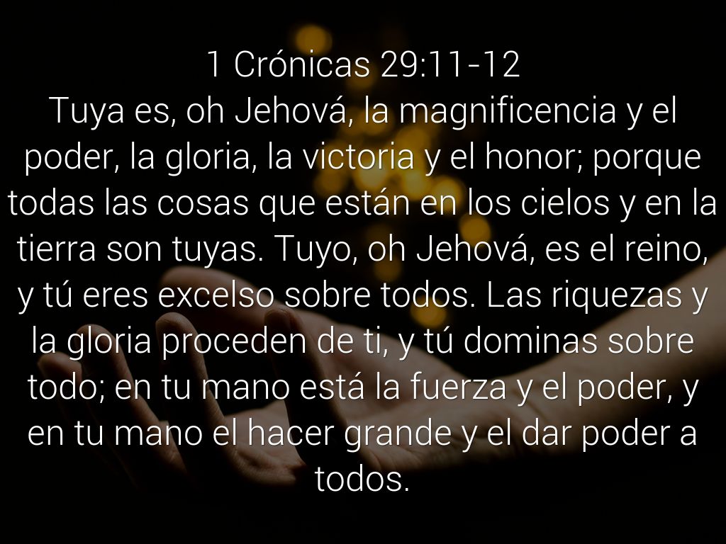 Tuya es, oh Jehová, la magnificencia y el poder, la gloria, la victoria y el honor; porque todas las cosas que están en los cielos y en la tierra son tuyas. Tuyo, oh Jehová, es el reino, y tú eres excelso sobre todos. Las riquezas y la gloria proceden de ti, y tú dominas sobre todo; en tu mano está la fuerza y el poder, y en tu mano el hacer grande y el dar poder a todos.