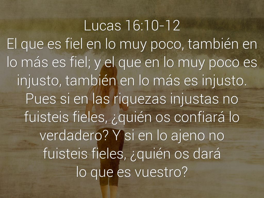 El que es fiel en lo muy poco, también en lo más es fiel; y el que en lo muy poco es injusto, también en lo más es injusto. Pues si en las riquezas injustas no fuisteis fieles, ¿quién os confiará lo verdadero? Y si en lo ajeno no