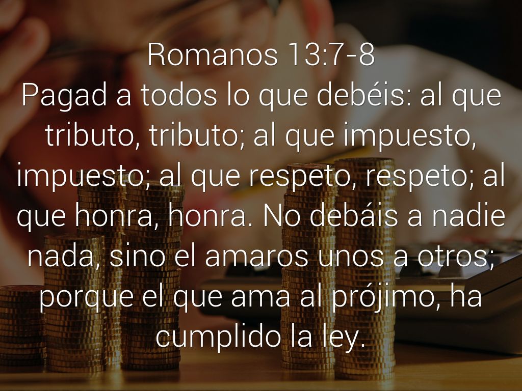 Pagad a todos lo que debéis: al que tributo, tributo; al que impuesto, impuesto; al que respeto, respeto; al que honra, honra. No debáis a nadie nada, sino el amaros unos a otros; porque el que ama al prójimo, ha cumplido la ley.
