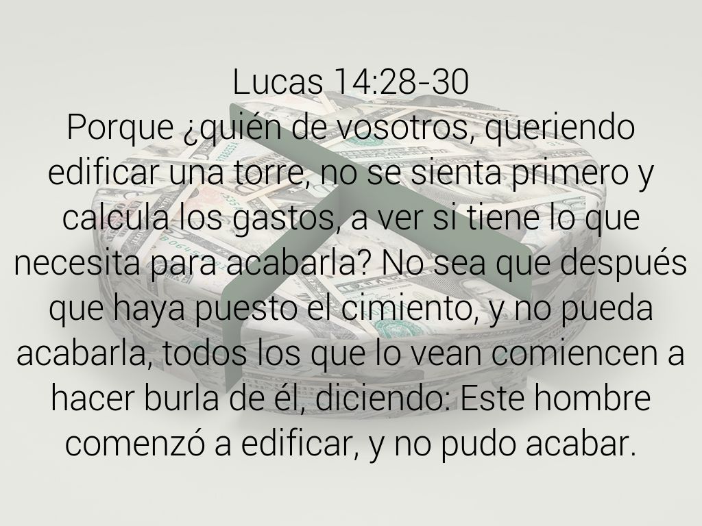 Porque ¿quién de vosotros, queriendo edificar una torre, no se sienta primero y calcula los gastos, a ver si tiene lo que necesita para acabarla? No sea que después que haya puesto el cimiento, y no pueda acabarla, todos los que lo vean comiencen a hacer burla de él, diciendo: Este hombre comenzó a edificar, y no pudo acabar.
