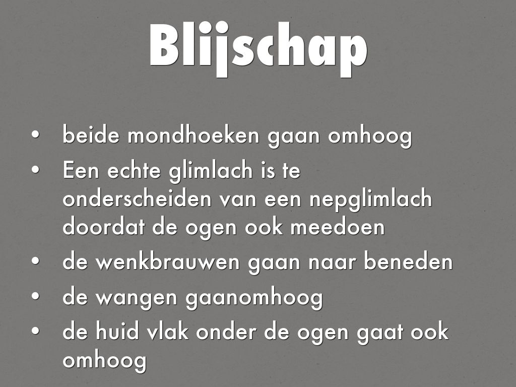 : beide mondhoeken gaan omhoog. Een echte glimlach is te onderscheiden van een nepglimlach doordat de ogen ook meedoen: de wenkbrauwen gaan naar beneden terwijl de wangen omhoog gaan, evenals de huid vlak onder de ogen.