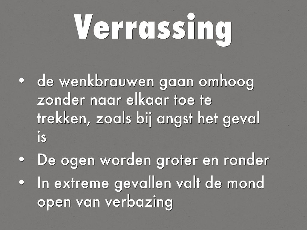 : de wenkbrauwen gaan omhoog zonder naar elkaar toe te trekken, zoals bij angst het geval is. De ogen worden groter en ronder. In extreme gevallen valt de mond open van verbazing.