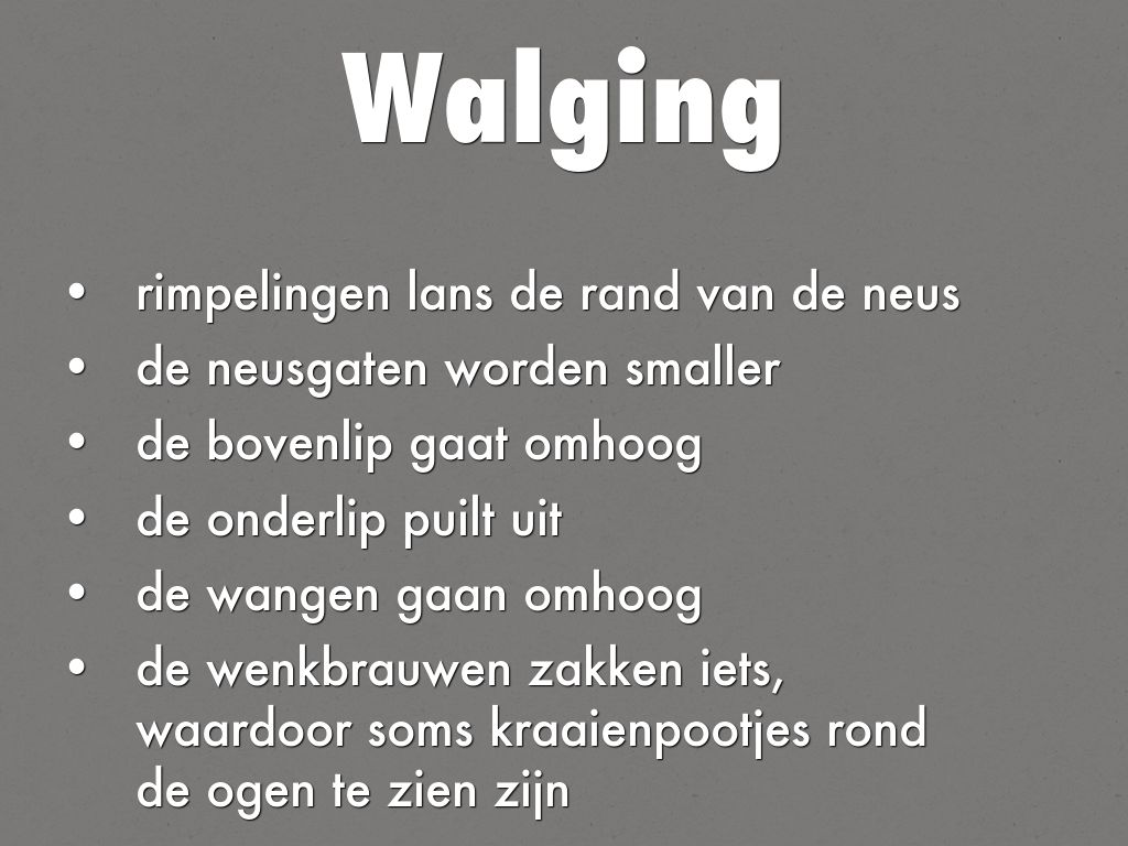 : rimpelingen lans de rand van de neus. De neusgaten worden smaller, de bovenlip gaat omhoog, de onderlip puilt uit, de wangen gaan omhoog. De wenkbrauwen zakken iets, waardoor soms kraaienpootjes rond de ogen te zien zijn