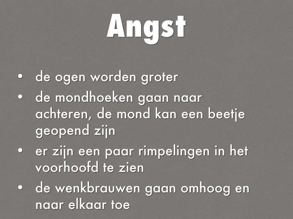 : de ogen worden groter, de mondhoeken gaan naar achteren, de mond is een klein beetje geopend. Er zijn een paar rimpelingen in het voorhoofd te zien; de wenkbrauwen gaan omhoog en naar elkaar toe.