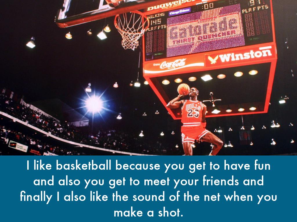 I like basketball because you get to have fun and also you get to meet your friends and finally I also like the sound of the net when you make a shot.