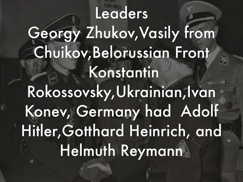 Konstantin Rokossovsky,Ukrainian,Ivan Konev, Germany had Adolf Hitler,Gotthard Heinrich, and Helmuth Reymann